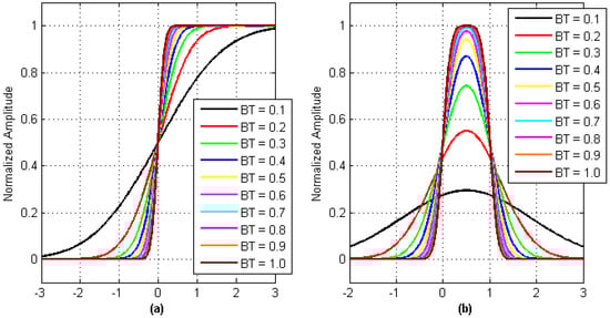Relation between unit response of Gaussian Filter and parameter BT. (a) Gaussian filter unit-step response; and (b) Gaussian filter unit impulse response.