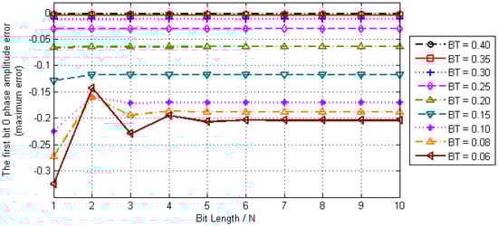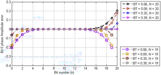 According to the characteristics of Gaussian function, it is known that the inter-symbol interference is more significant when the interval of the symbol sequence is smaller. Therefore, we still use the unit periodic sequence in which bit 0 and bit 1 alternate as the object of analysis. In Equation (16), let T = 1 and , where N is the number of bits. Under such conditions, the influence of inter-symbol interference on the timestamp differential property when the parameter BT takes different values is shown in Figure 6.