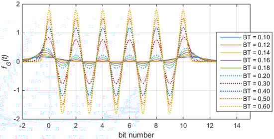 The signal characteristics of the Gaussian baseband waveform are completely determined by the Gaussian filter, which is a low-pass filter in which unit impulse response satisfies the Gaussian distribution where the mean value is 0 [].