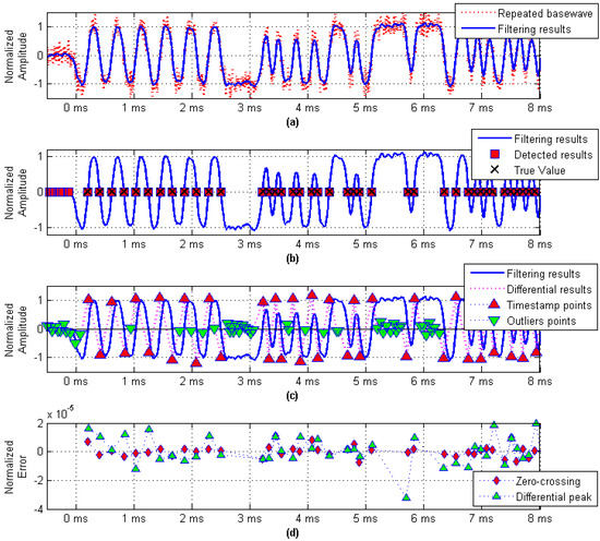 As shown in Figure 7a, the SNR is equal to 10 dB, and the noise suppression was performed using a Gaussian filter whose parameter BT was set to 0.6. Figure 7b shows the relationship between the real value and the timestamp detection result, which was obtained using the zero-crossing detection method. The results obtained by the differential peak detection method for the same baseband signal are shown in Figure 7c. Since the differential detection method is more sensitive to signal jitter, there will be a large number of outliers. In addition, the amplitude of outliers related to the SNR makes the differential peak detection method much more complex than the zero-crossing detection method in actual use. Figure 7d compares the zero-crossing detection method and the differential peak detection method. It can be seen that the error jitter range of the zero-crossing detection method is smaller than that of the differential peak detection method.
