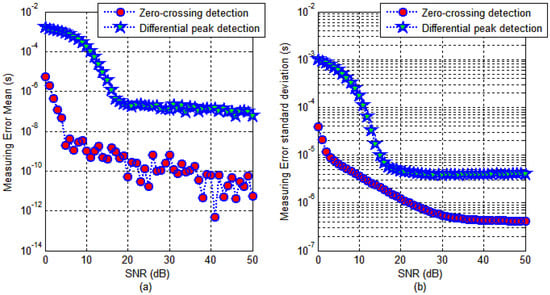 It can be seen in Figure 8 that the zero-crossing detection method is better than the differential peak detection method under the same conditions. The mean of the measurement error is defined as μ, and the standard deviation is defined as σ. Assuming that the measurement results are normal distribution, according to statistics, we can get that the probability of detection is 68.4% in the range of [μ − σ, μ + σ].