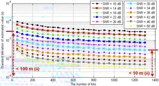 Under the conditions of different SNRs and the numbers of packets, the simulation test was carried out by using the timestamp detection method and the optimal estimation algorithm proposed in this paper. The simulation was repeated 1000 times under each condition, and the standard deviation of the measured results was calculated. The simulation results are shown in Figure 9.
