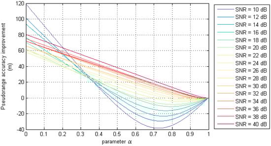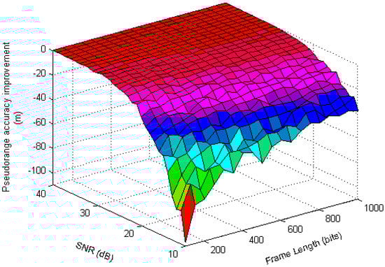 According to the difference filtering algorithm defined by Equations (21) and (22), the improvement of the pseudorange estimation accuracy under different frame length and SNR is shown in Figure 12.