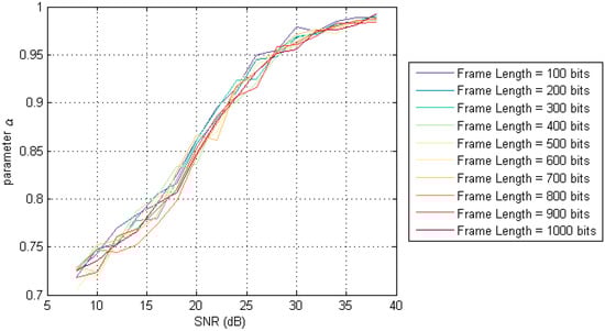 The relation between α and SNR under different frame length.
