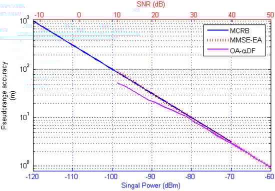The transmission delay threshold given in [] was concerned with the signal power, and the measurement method and optimal estimation algorithms presented here focus on the SNR of the baseband signal. Both are descriptions of received signal power. It can be seen in Figure 13, that the performance of the MMSE-EA algorithm (based on the zero-crossing detection) is in agreement with the theoretical threshold characteristic given by Equation (23). The OA-αDF algorithm proposed in this paper can effectively improve the accuracy of pseudorange estimation under low SNR conditions.