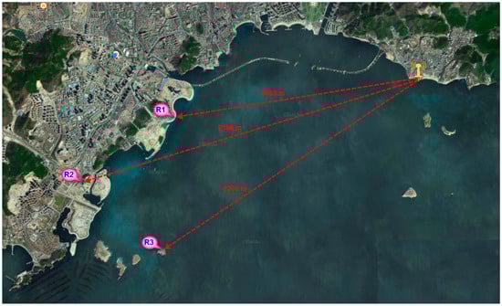 The field test site was located in Xinghai Bay, Dalian City, Liaoning Province. To ensure that there was no obstruction between the two points, we set up one fixed transmitting station and three receiving stations (Figure 16). The distance shown in the figure is the actual distance calculated from the longitude and latitude coordinates. The accuracy of the pseudorange measurement was statistically analyzed by the method of fixed-point multiple tests.