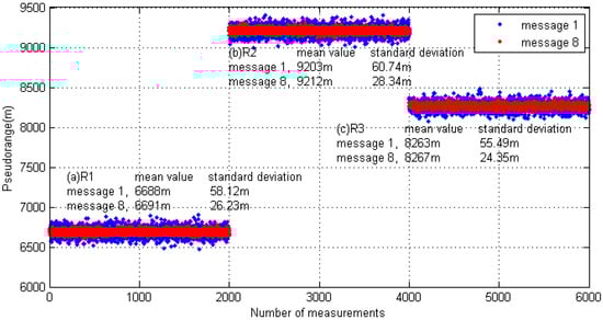The test was divided into short- and long-message ranging. In the short-message ranging experiment, the transmitter station only sent Message 1 and the length of the link layer packet was approximately 224 bits. In the long message ranging experiment, the transmitting station only sent Message 8, and the length of the link layer packet bit was approximately 1064 bits. In both test conditions, the contents of the transmitted message were not fixed, but encapsulated according to real-time information. In order to protect the transmitter's power amplifier, the transmission interval was set to five seconds. For different test content, each receiving point continuously collected about three hours of test data. The pseudorange measurement results are shown in Figure 17.