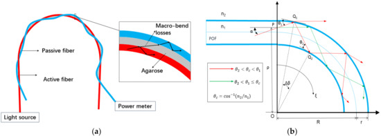 As shown in Figure 1b, the macro-bend section of the fiber is displayed where the ray tracing method has been employed to analyze the light losses [23]. According to the Fresnel formula, the reflection takes place on the interface of medium with different RI. For POFs (Mitsubishi, SK40) we select here, as the thickness of the cladding (10 μm) is considerably small by contrast to the diameter of the core (980 μm), the core-cladding interface and the cladding-agarose interface have been simplified to a core-agarose interface here.