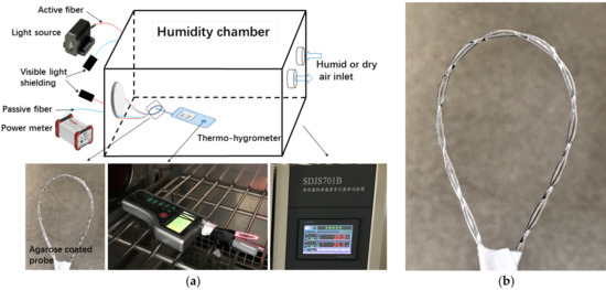 (a) Experimental setup of the proposed RH sensor; (b) The photo of the agarose coated probe.