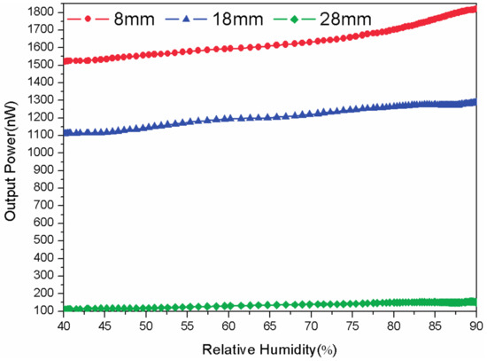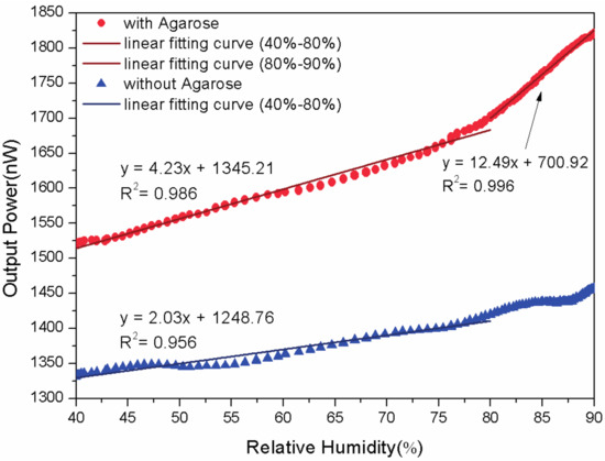 The humidity response of the sensor with and without the agarose gel is observed and the result is depicted in Figure 3. The bend radius of these probes here is 8 mm. When RH raises from 40% to 80%, the probe without agarose has a sensitivity of 1.49 nW/% with a slope linearity of 80.00%. The limit of detection is 2.92% and it is calculated by dividing the standard deviation with the sensitivity. Correspondingly, the probe with agarose has a higher sensitivity of 4.23 nW/% with a better linearity of 99.30%. The limit of detection decreases to 0.70%, which means the agarose coated probe is more efficient. Reason for that is the higher RH means the higher RI of agarose in the gap between the two fibers, which leads to an apparent increase of the side coupling power. The performance comparison is summarized in Table 1. When RH raises from 80% to 90%, the sensitivity of the agarose coated probe increases to 12.49 nW/% with the linearity of 99.8% and the limit of detection decreases to 0.55%. It can be observed that the proposed sensor has a maximum sensitivity of between 80% and 90% and this quality could be adopted for potential applications in high-humidity atmosphere.
