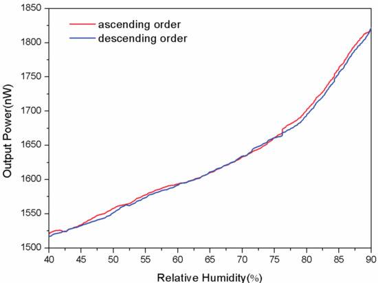 The reversibility is an important factor to consider when evaluating a sensor. In Figure 5, the output power of the passive fiber is observed in the humidification-dehumidification cycle. As can be seen, the maximum difference is 8.1 nW which is small and acceptable compared with the full-scale output of 305.06 nW.