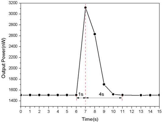 As the adjustment speed of the humidity chamber is too slow to study the response time of the sensor, a step change of RH is achieved by exhale a 1 s long breath directly to the probe [9,14,15]. To evaluate the response time, this method could not give an accurate value but provide a reference. The ambient humidity during the experiment is 40%RH and the temperature is 25 °C. The result is shown in Figure 6. Limited by the detecting precision of the power meter, the response time is less than 1 s and the recovery time 4 s, which is much faster than traditional humidity sensors.