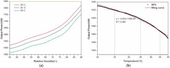 Finally, the temperature dependence of the sensor is investigated. Since the thermo-optic (TO) coefficient of POFs is relative high compared to the one of GOFs and the agarose gel are temperature dependent, the result is a combined influence of both dependencies. As shown in Figure 7a, the beginning output power of the sensor is different while the temperature of the chamber is set at 25, 35, and 45 °C, respectively. However, the slope of the curves practically does not change, which means the sensitivity of the sensor is temperature-independent. The Figure 7b illustrates the change of the output power with the temperature gradually raising from 20 °C to 50 °C when the RH is set to 40%. The sensor exhibits a linear change with temperature varying from 20 °C to 50 °C. Therefore, a temperature compensation is easy to obtain like introducing a thermometer and so on.