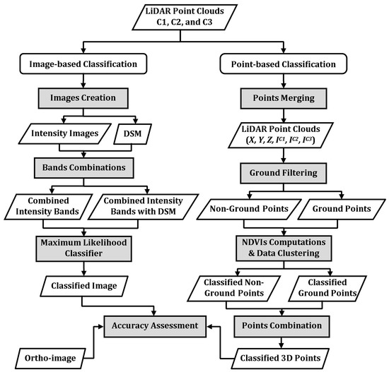 The workflow of the proposed image-based classification technique starts by creating raster images from LiDAR point cloud data. Three intensity images are created from the recorded intensity values at the three wavelengths. In addition, the points’ elevations are used to create a height image (i.e., DSM). The pixel (cell) size equal to double average point spacing (i.e., 1 m) is selected to ensure a sufficient number of points within the cell. The mean intensity values or elevations were calculated from all points within a pixel and assigned to that pixel. A moving average window 3 by 3 is then used to fill the voids between pixels in the created images [31]. Two band combinations are stacked, namely intensity images from the three wavelengths (combined intensity bands) and intensity images with DSM (combined intensity bands with DSM). After that, training areas for four classes are selected based on an aerial image of the study area to produce a spectral signature for each class. Some classes are composed of separately-sampled classes to account for the variety in the spectral attribute. For instance, buildings class is comprised of samples from various roof colors, such as white roofs, grey roofs and red roofs. Furthermore, samples from high vegetation with different greenness values are included in the trees class. Finally, a supervised classification, the maximum likelihood classifier, is applied to the two band combinations. The maximum likelihood classifier accounts for the probability that a pixel/point belongs to a particular class and considers the variability of classes.