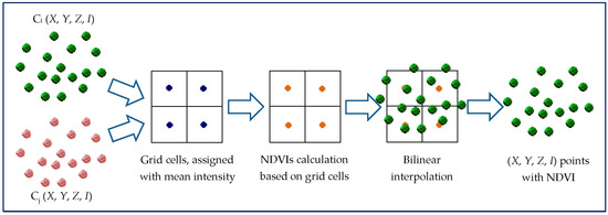 In [29], another method was presented to combine the LiDAR data from the three channels. The LiDAR data from each channel were divided into grids with a cell size of 1 m. The mean intensity value of all points within a cell was assigned to the cell’s center. Three spectral indices’ grids were then calculated using the mean intensity values of the grid cells. The three spectral indices’ values were then interpolated to each LiDAR point using bilinear interpolation from the spectral indices’ grids based on the point’s location, where the adjacent cell centers were used in the calculation. After that, the LiDAR points with the three spectral indices were used for land/water discrimination and land cover classification [29]. This process is summarized in Figure 3.