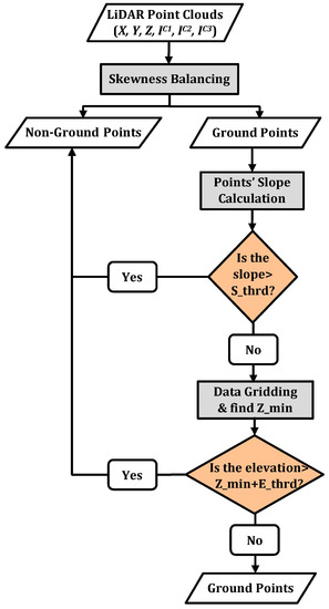 The elevations of the point clouds are first sorted in ascending order. The skewness is then calculated using Equation (5) from all points. If the skewness is greater than zero, the point with the highest elevation is removed and classified as a non-ground point. The remaining points are used to calculate the skewness, and the process is repeated until the skewness of the point clouds is balanced (Sk = 0). After the skewness balancing is performed, the remaining points are classified as potential ground points and assumed to be within a specific slope. As such, the output separation is refined based on the measurement of the slope changes of each LiDAR point with respect to its neighboring points. A threshold value (S_thrd) is applied to label the points with a higher slope as non-ground points. Moreover, the remaining ground points are divided into grids to filter out the points with higher elevation. For each grid, a minimum elevation is calculated (Z_min), and a threshold value to elevation (E_thrd) is applied.