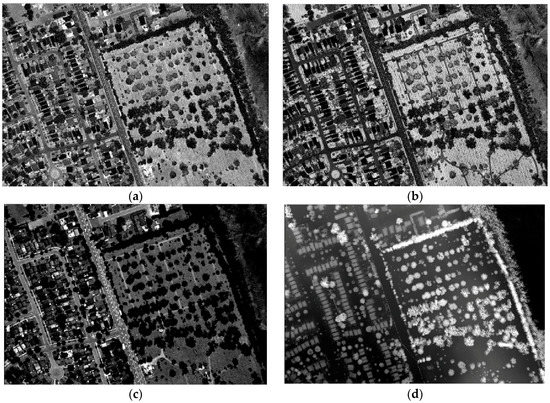 LiDAR raster images: (a) C1 intensity; (b) C2 intensity; (c) C3 intensity; (d) DSM.