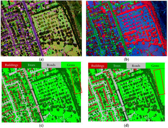 In particular, the results demonstrated the importance of combining LiDAR intensity and height data, where the overall accuracy increased by more than 12% after the DSM was incorporated with the intensity images. This is clearly notable in Figure 7c, where some pixels (marked by red rectangles) in the study area were misclassified as trees (i.e., high vegetation). Furthermore, many pixels that belong to the road surface were misclassified as buildings, while those pixels were correctly classified as grass (i.e., low vegetation) or roads, after DSM was incorporated as shown in Figure 7d (marked by black rectangles). Significant improvements of the producer’s and user’s accuracies were achieved for the individual land covers when DSM was considered. For instant, an improvement was achieved for the producer’s accuracy of buildings, trees and roads classes by 29.7%, 9.1% and 13.3%, respectively. Furthermore, the user’s accuracy of trees and roads classes was improved by 15.4% and 28.8%, respectively.
