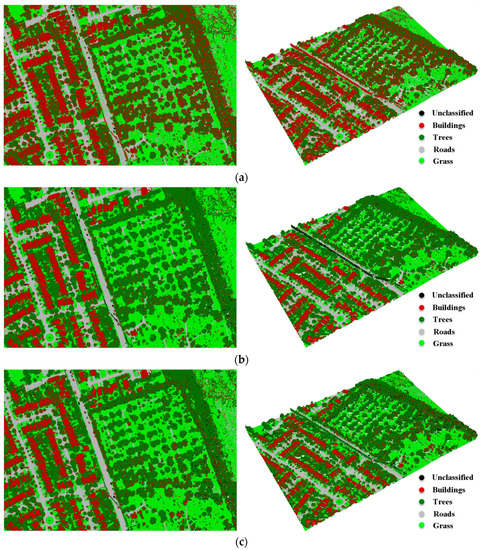 This technique involved ground filtering and NDVIs computation, which were applied on elevation and intensity attributes, respectively. Subsequently, the points were clustered into different classes. The ground filtering started with skewness balancing in order to separate ground points from non-ground points. The ground points were then refined based on the slope-based change mechanism. The slope of each point with respect to surrounding points was investigated; so that if the slope were greater than a threshold value (S_thrd = 10°), the point was classified as a non-ground point. In addition, a few points with higher elevations were not classified as non-ground points. Therefore, the output ground points were divided into grids with a cell size of 25 m. For each grid, if the elevation was greater than 3 m (E_thrd = 3 m) above the minimum elevation, the point was classified as a non-ground point. The ground points include roads and grass classes, while the non-ground points include buildings and trees classes. The NDVIs were subsequently computed using Equations (8)–(10). Table 5 shows the threshold values obtained by applying the Jenks break optimization method to the NDVIs for both non-ground and ground points in order to separate buildings from trees and roads from grass, respectively. The vegetation (i.e., trees or grass) has high reflectance at the NIR, MIR and green wavelengths. As a result, the calculated NDVIs of the vegetation points exhibited higher values than the built-up areas (i.e., buildings or roads). Therefore, for a particular point, if NDVINIR-MIR, NDVINIR-G or NDVIMIR-G ≤ NDVI_thrd, the cover type belongs to the buildings or roads class; otherwise, it belongs to the trees or grass class. Figure 8 shows the 3D classified point clouds based on the three NDVIs. The confusion matrix, overall accuracy and kappa statistics for the three cases are provided in Table 6, Table 7 and Table 8.