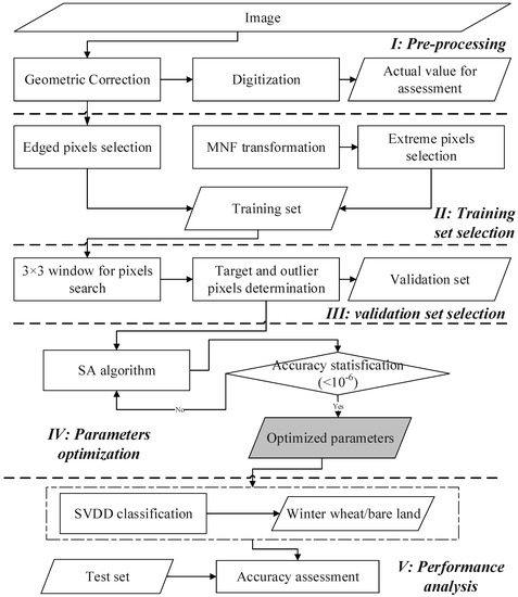 The proposed method includes four modules (Figure 1): (1) training set selection; (2) validation set selection; (3) optimized parameter determination using simulated annealing (SA) algorithm; and (4) SVDD-based specific land-cover classification. Each module is described in the following sections.