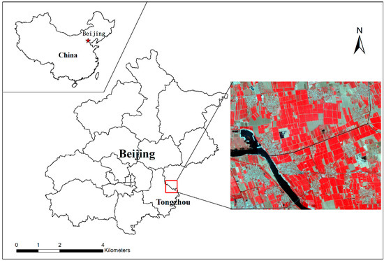 A sub-region of Tongzhou, a district of southeast Beijing in China, was selected as study area, which covers an area of approximately 40 km2 (39°1′ N–39°4′ N, 116°2′ E–116°8′ E) (Figure 3). The topography is flat, and the fragmented agriculture land is a typical landscape in this area. The agriculture land is dominated by winter wheat. The other three primary land covers in this area, including trees, bare land and water, are mosaicked with the cultivated land.