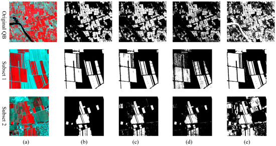 Comparison wheat classification results of different methods (a) Original remote sensing image; (b) reference result as actual data; (c) support vector machine (SVM) classification result; (d) WVS-SVDD classification result; (e) traditional SVDD method.