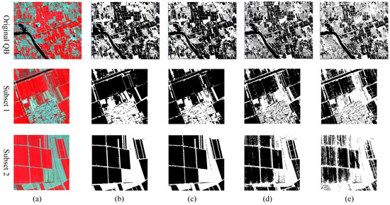Comparison bare land classification results of different methods (a) Original remote sensing image; (b) reference result as actual data; (c) SVM classification result; (d) WVS-SVDD classification result; (e) traditional SVDD method.