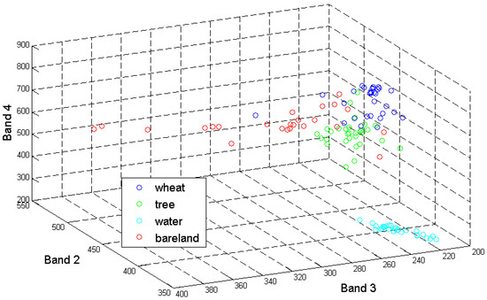 Table 4 showed accuracy of SVDD and SVM classification to map wheat. Under the condition of the use of training set with all defined classes, both SVDD and SVM achieved good performance with overall accuracy above 95%. However, the outlier class had obvious impacts, following reduction of classes in the non-wheat samples, on SVM classification accuracy. From the three-dimensional view of the scatterplot of land-cover types in Figure 8, wheat lies between bare land and trees, thus these two classes are necessary to construct an optimal hyperplane for separating wheat from other non-wheat land-cover types based on the principle of SVM. When trees or bare land were removed from the training set, classification accuracy decreased to some extent. In particular, the binary SVM derived the poorest classification with an overall accuracy of 76.28%, while neither trees nor bare land were included in the training set. The user’s accuracy was only 59.63%, indicating that the pixels representing areas of bare land and trees were commissioned into wheat. On the other hand, water is located far away from wheat, having little influences on the hyperplane. Therefore, excluding water in the training set had little impact on classification; overall accuracy was 96.01%, which was still at the same level with that derived by exhaustive training set. These results suggest that SVM is sensitive to the untrained class and an exhaustive training set is necessary to ensure an accurate classification. However, how to achieve the exhaustively defined training set is a big challenge. Instead, the WVS-SVDD still achieved good performance with high overall accuracy, with little sensitivity to whether trees or bare land pixels were excluded from the validation set, and was able to reach the same level of the SVDD classification as the original validation set. This is because the hypersphere constructed using the optimal C and s with support of window-based validation set could create the enclosed space to determine the wheat, suffering little influence from untrained non-wheat classes. Thus, WVS-SVDD is much less sensitive to the untrained classes than SVM, highlighting the value of SVDD for mapping one specific class which could significantly reduce the number of training pixels compared to multi-class classification where an exhaustive training set is required to keep classification accuracy. Compared to SVM, WVS-SVDD only requires few training and validation sets to ensure the target class classification performance.