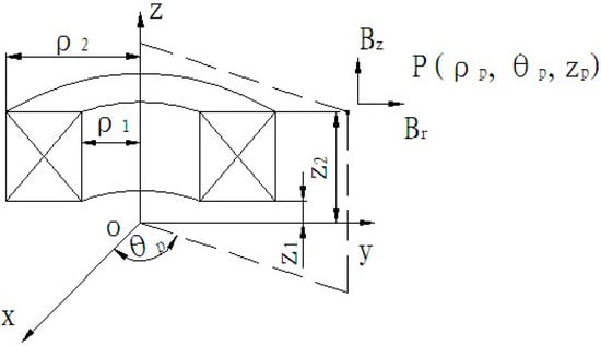Here, Bz is the axial magnetic-field strength at point P; Bρ is the radial magnetic-field strength; μr is the relative magnetic permeability; μ0 is the permeability of vacuum; ρ1 is the inner radius of the solenoid coil; ρ2 is the external radius of the solenoid coil; θP, ρP and zP are the cylindrical coordinates of point P; J is the current density; z1 is the axial coordinate of the bottom plane of the solenoid coil; z2 is the radial coordinate of the upper surface of the solenoid coil; n is the number of turns of the electromagnetic coil; U is the service voltage; R1 is the resistance of the electromagnetic coil; R2 is the coil resistance.