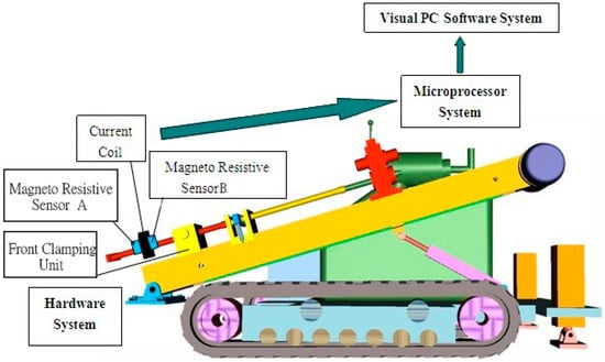 The current coil is fixed beside the front clamping unit, coaxially with the drill stem. Two magnetoresistive sensors—Sensors A and B—are fixed on the sides of the current coil symmetrically. They detect the real-time different changes of the magnetic field produced by the movement of the drill stem and the drill-stem joint through the current coils. A critical value is set to judge whether the drill-stem joint or drill-stem is passing through the clamping unit.