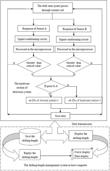 The movement direction of the drill stem must be identified according to the order of the responses of Sensors A and B. The magnetic-field changes that occur when the drill stem and drill-stem joint perform forward or backward movement have the same direction, even if their magnitudes differ. If Sensor A indicates the change of the magnetic field prior to Sensor B, the power unit is in the status of feeding in the drill stem, i.e., performing forward movement; thus, the number of forward drill-stem joints n1 is increased by 1 and written to the memory chip in terms of the real-time change. Otherwise, the power unit is in the status of hoisting the drill bit, i.e., performing backward movement; thus, the number of backward drill-stem joints n2 is increased by 1 and then written to the memory chip in terms of the real-time change.
