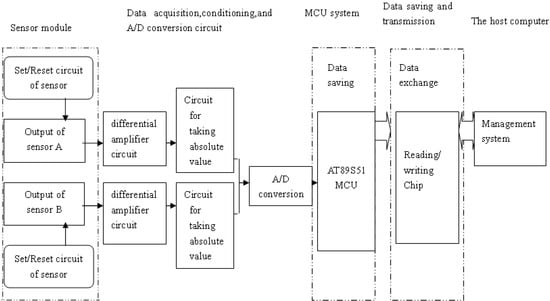 A structural diagram of the microprocessor system for the drilling-length detection system for directional drilling is illustrated in Figure 6. The detection system collects real-time signals from the two magneto resistive sensors. After passing through a series of signal-conditioning circuits for differential amplification, filtering, taking the absolute value, and analog-to-digital (A/D) conversion, the signals of the magneto resistive sensors are transmitted to the micro programmed control unit (MCU). The signals are processed by the MCU to determine whether the drill-stem joint passes through the current coil and determine the movement direction according to the responding sequence of the two magneto resistive sensors. Then, the drilling-length data processed by the MCU are stored in the memory chip as digital data.