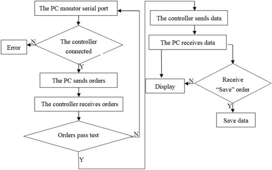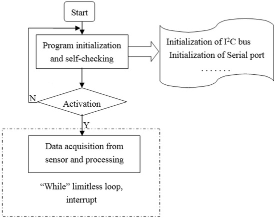 The slave computer programming design can be divided into five programs: the sensor data acquisition and processing subprogram, I2C communication subprogram, interrupt subprogram, subprogram for data transmission between the slave and host computer subprograms, and main program. The main program performs the data acquisition, processing, and saving by calling the corresponding subprograms. A flow chart of the main program is shown in Figure 7. Flow charts of the subprograms are not shown herein.