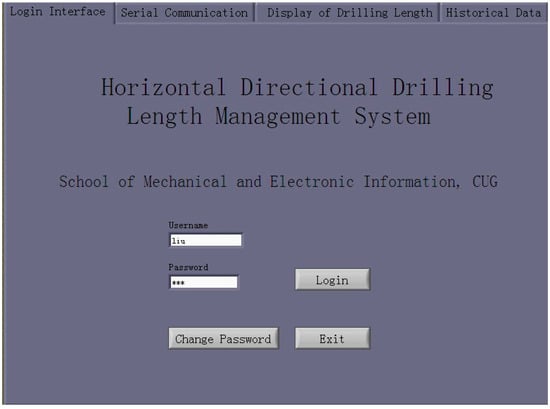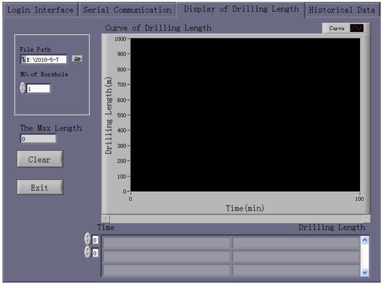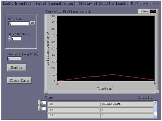 The host-computer software of the drilling-length management system is compiled via the programming methodology of Virtual Instrument Software Architecture in a LabVIEW environment [22]. All the performances are realized in four optional visual tabs: (1) login; (2) serial communication; (3) data processing, display, and storage; and (4) replay for historical data.