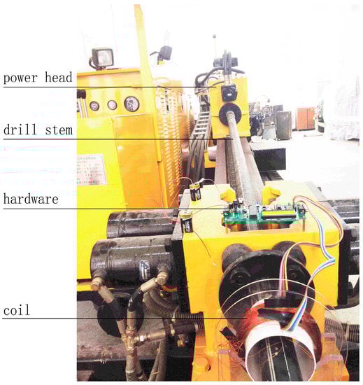 The directional drilling rig ZT-18 was employed to perform experiments. The sensor applied in the experiments was HMC1021Z magneto resistive sensor made by the Honeywell Company (Morristown, NJ, USA) with a detection range of −6 to +6 Gs. The drill stem and drill-stem joint moved forward in turn. The experiment is illustrated in Figure 13.