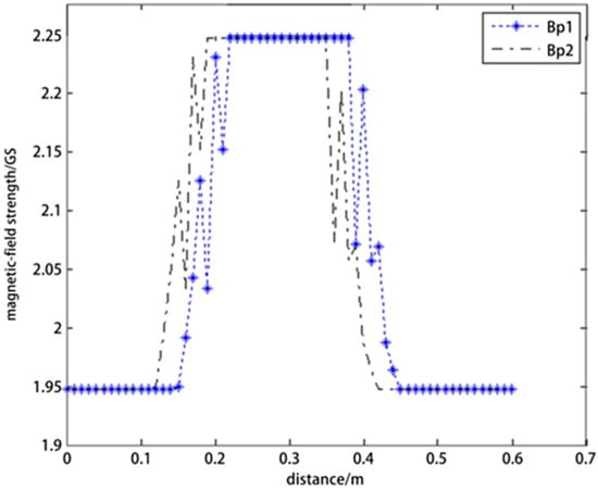 Bρ1 is the value detected by magneto resistive sensor A, and Bρ2 is the value detected by magneto resistive sensor B. When the drilling stem was in the current coil, Bρ was approximately 1.9 Gs, and when the drilling stem joint was in the current coil, Bρ was approximately 2.2 Gs.