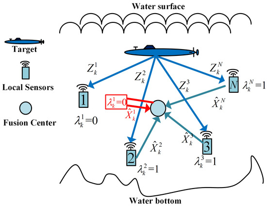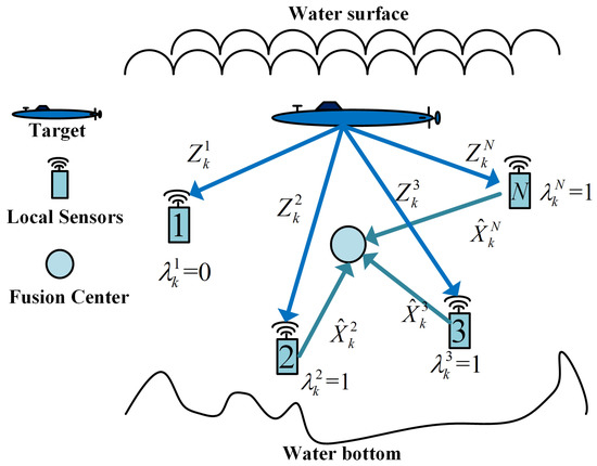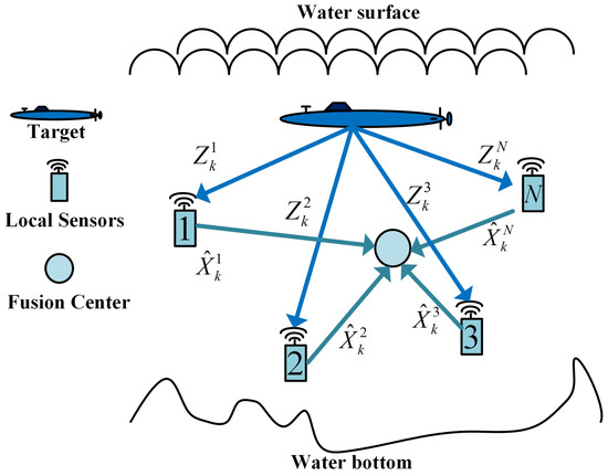 At the same time, different local sensors have different measurements about the same target. The information comes from different sensors must be fuse together to acquire more accurate estimates of target states. There are two types of fusion architectures, distributed fusion architectures and centralized fusion architectures. Distributed fusion architectures have advantages over centralized architectures in lower communications and processing costs. Therefore, distributed fusion architectures are preferential for application in resource-limited UWSNs. Figure 1 shows the normal structure of the distributed fusion system. Local sensors sample the measurements () from the target periodically. Then, based on new measurements and past information (), local sensors obtain local estimates () and transmit local estimates to the fusion center. Finally, the fusion center collects all local estimates and fuses them together to get the fusion estimate (). The fusion estimate will be sent back to local sensors to predict future target states.