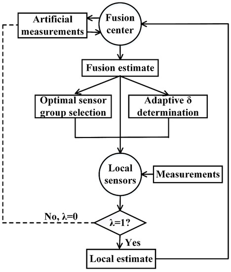 The flow chart of our artificial measurements-based adaptive filter is shown in Figure 4. It shows how information flows between the fusion center and local sensors. The dash line means the information flow from local sensors to the fusion center is non-existant when and artificial measurements are introduced to compensate this missing information flow.