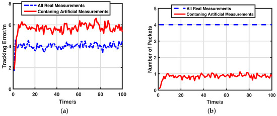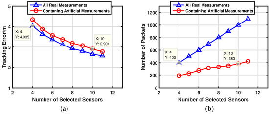 Moreover, in some cases, we want to improve tracking accuracy with less additional energy consumption. This goal can be realized by selecting more sensors and using our artificial measurements-based adaptive filter. In order to have more candidate sensors, the sensors are deployed as a uniform grid. The number of selected sensors at each step is changed from 4 to 11. We compare performances between artificial measurements-based adaptive filter with and conventional all real measurements-based filter. The averaged target tracking error and communication costs of the two schemes are shown in Figure 10a,b respectively. It is clear that selecting more sensors can improve target tracking accuracy effectively with regard to both schemes. However, the energy consumption of an artificial measurements-based adaptive filter increases much more slowly than a conventional all real measurements-based filter. That means our target tracking scheme can improve target tracking performance with less additional energy consumption. Through marked points in Figure 10, the energy cost of our scheme with is 4.25% less than conventional scheme with and the target tracking error of our scheme with is 28.1% lower than conventional scheme with . That means our scheme can have similar energy to a conventional scheme but get much better tracking performance than a conventional scheme.