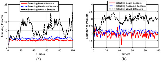 Sensor group selection is a feasible method to improve the energy-efficiency of target tracking in UWSNs. We compare performances of three sensor group selection schemes to support this opinion. Here, we set . Target tracking error and energy consumptions of three schemes are displayed in Figure 9a,b, respectively. Selecting the best four sensors means that the sensor group is optimized using Equation (48). In contrast, selecting the worst four sensors means the sensor group is generated by