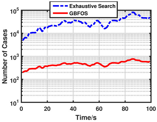 In a dense sensor network, the exhaustive search needs to try too many cases to find the best sensor group, which deteriorates the real-time performance of our optimal sensor group selection scheme. Hence, we use the GBFOS algorithm to reduce the number of cases and improve the computation efficiency of our optimal sensor group selection scheme. The number of cases needed to try to find the best sensor group of exhaustive search and GBFOS is plotted in Figure 11. Here we set . Compared with the exhaustive search, the GBFOS algorithm reduces the number of cases by about two orders of magnitude. Hence, the GBFOS algorithm can remarkably improve the real-time performance of our optimal sensor group selection scheme.