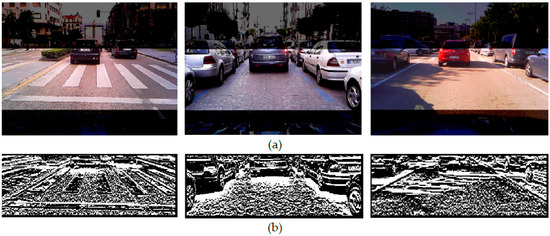 Figure 2a show the resulting binary mask M(x, y) after application of the saturation and intensity difference constraints, i.e., Equations (2), (4), (5) and (12). It can be observed that gradients due to the shadow under vehicles satisfy the conditions whereas most of the gradients caused by other elements in the scene are rejected from M(x, y). Nevertheless, the gradients due to colourless elements such as lane markings, lateral shadows, kerbs and noisy elements still remain. In order to identify the gradients due to shadow, intensity thresholding is performed.