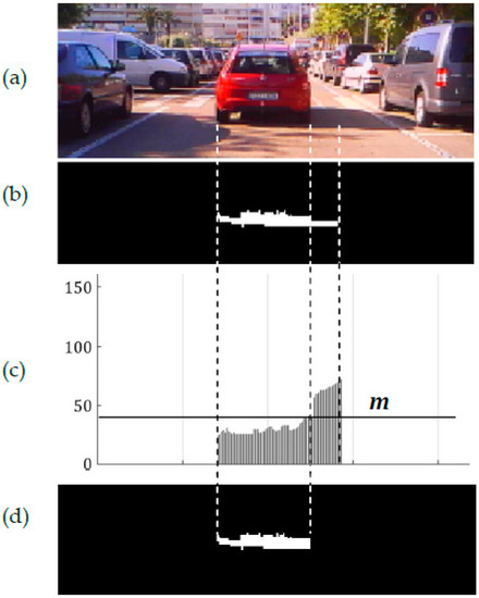 The filtering is as follows. First, horizontal clusters in M(x, y) are extracted by an opening operation using a structuring element based on the minimun ideal vehicle width, i.e., the width of the vehicle placed furthest. The proposed system is intended for urban traffic and it is designed to detect vehicles at a distance up to 20 m from the ego-vehicle. Thus the size of the structuring element corresponds to the width of the vehicle at 20 m which is obtained experimentally by placing a vehicle at this distance. This morphological operation focuses on eliminating vertical and inclined parts of clusters in M(x, y) such as those corresponding to kerbs and lateral sides of both a parked vehicle and a vehicle travelling in parallel lanes (see Figure 5a).