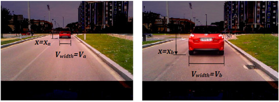 This relationship is determined by two frames of an image sequence where the vehicle ahead is at different distances away from the ego-vehicle. For our camera setting, in the first frame the vehicle ideal width va is 30 pixels and the bottom of the vehicle xa is located at 15 x-coordinate, whereas in the second frame the vehicle ideal width vb is 178 pixels and its bottom xb is located at 100 x-coordinate (where x-coordinate represents the row with respect to the top of the searched image region). Thus, the linear relationship between the ideal width vwidth of the vehicle ahead and its vertical location x in the image is