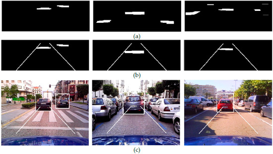 (a) Binary mask M(x, y) of Figure 2 after horizontal clusters extraction (b) M(x, y) after morphological thresholding and ROI establishment; and (c) vehicle hypotheses including those out of the ROI.