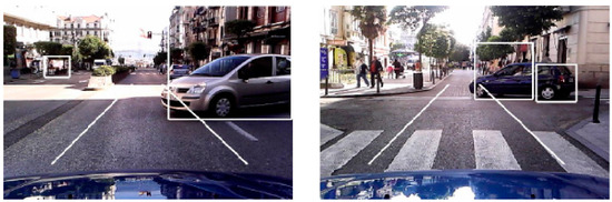 On the other hand, the use of shadow under vehicles may lead to hypotheses of vehicles which are out of the scope of the system such as vehicles travelling in parallel lanes (in both directions), vehicles parked by the lane or vehicles whose rear is occluded to some extent (generally by other vehicles). However, as the system focuses on vehicles travelling within the ROI, the number of final vehicle hypotheses is significantly reduced. Special mention must be made of vehicles travelling transversely to the ego-vehicle trajectory, i.e., in crossroads (see Figure 7) and roundabouts. The clusters of gradients due to their shadows can satisfy the morphological filter, thus providing hypotheses of vehicles out of the scope of the system.