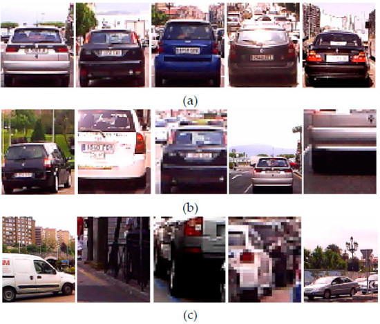 Example results: (a) positive hypotheses, (b) hypotheses corresponing to vehicles incorrectly framed; and (c) false positives corresponding to non-vehicles or vehicles out of system’s scope.