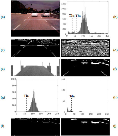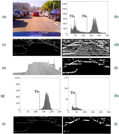 As stated above, the intensities of upper pixels of the remaining gradients are smaller than that of the road so the threshold Th2 is smaller than Th1. Comparing both thresholds (see Figure 9b), Th2 is closer to the intensity level of shadows under vehicles, thus the thresholding performed with Th2 is more effective, rejecting a higher number of gradients that are not due to the shadow under a vehicle (see Figure 9i,j). However, this fact becomes more significant in road scenes with lateral shadows or alphalt stains and patches.