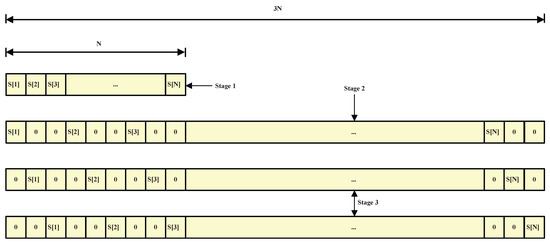 As the second stage involves interleaving zeros after each discrete spectrum, where M represents the number of transmitters used by an UPS, the new data sequence has discrete spectra, with the data sequence obtained dedicated to the first transmitter. Based on the example shown in Figure 1, if three transmitters are used by an UPS, we need to interleave two () zeros after each discrete spectrum. It is noted that, due to its zero interleaving , the length of the data sequence is increased from N to 3N ( 3N). In addition, it (zero interleaving) refers to the repetition of the signal (M times). Mathematically, in the time domain, the signal dedicated to the first transmitter (i.e., the time domain signal of stage 2) is defined as: