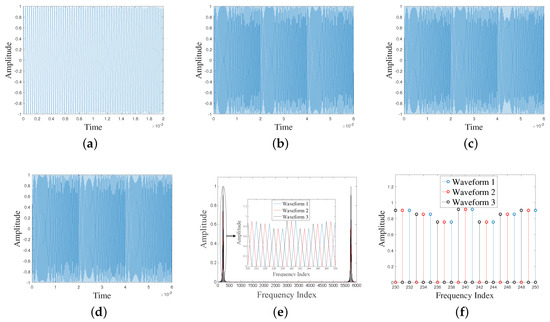(a) 35–45 kHz/2 ms chirp in time domain with sampling frequency 1 MHz; (b–d) three orthogonal chirp waveforms respectively, generated from (a); (e) corresponding frequency spectra of the three orthogonal chirp waveforms shown in (b–d); and (f) stem graph of the zoom plot of (e).